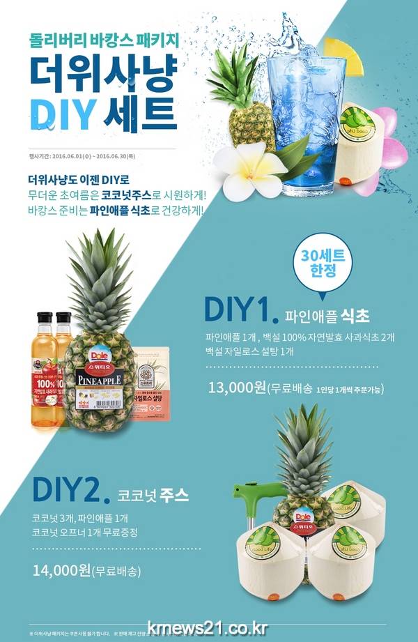 나호섭 돌(Dole) 코리아 마케팅팀장은 “고객들이 각자의 다양한 취향에 맞게 직접 제조해 즐길 수 있는 바캉스 패키지를 준비했다.”며, “예년보다 빨리 찾아온 더위에 돌리버리 파인애플 식초세트와 코코넛 주스 세트로 바캉스 시즌을 특별하게 보낼 수 있길 바란다.”라고 소감을 밝혔다.