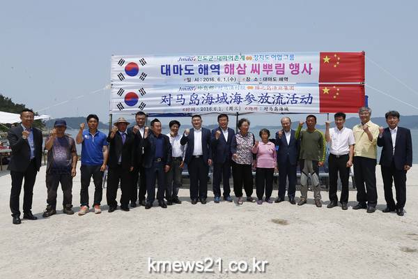 진도군에서는 지난 1일 조도 대마도 현장에서 진도군 과 중국 장자도 그룹 임직원, 조도 대마도 주민들이 참여한 가운데 대마도 해역에서 해삼 씨 뿌림 행사를 가졌다.