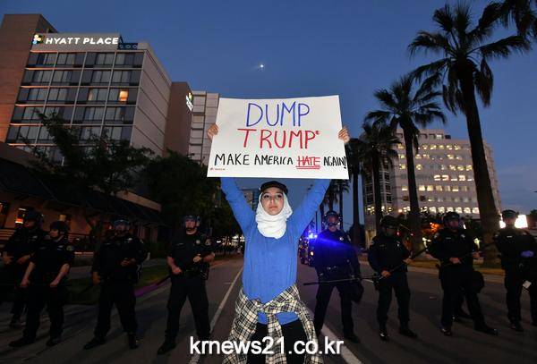 시위대는 "우리 주(州)에서 증오는 안돼"(No hate in our state)와 "트럼프를 버려라"(Dump Trump)를 외치며 캘리포니아 북부 산호세 컨벤션 센터 근처를 행진했다.