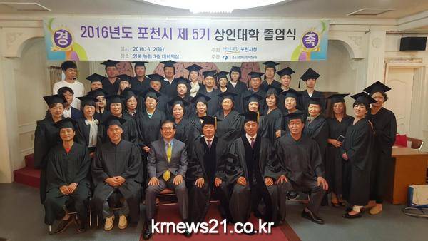 포천시가 주최하고 중소기업혁신전략연구원 주관으로 상인 및 예비창업자등 56명이 신청한 가운데 지난 3월14일에 입학한 「포천시 제5기 상인대학」졸업식을 6월 2일 영북농협 3층 대회의실에서 개최하였다.