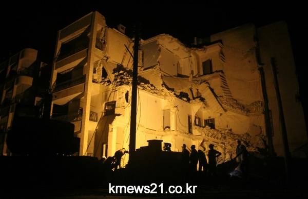 시리아 공습 후 잔해들 사이에서 생존자를 찾고 있는 시리아 민방위 대원들