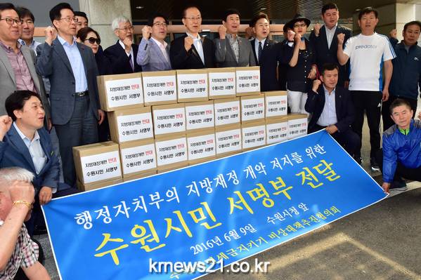 행자부의 일방적인 지방재정 개편안 철회를 촉구하는 수원시민 세금지키기 비상대책추진협의회는 나머지 5개(성남‧화성‧용인‧고양‧과천) 불교부단체 비대위와 함께 9일 서울 광화문 서울정부청사에 지방재정개편 반대 시민 서명부를 전달했다.