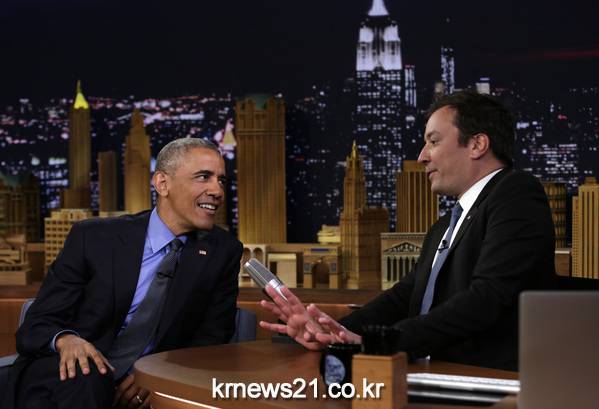 ▲ ⓒYURI GRIPAS / AFP8일(현지시간) '지미 팰론 더 투나잇 쇼'를 촬영하고 있는 오바마 대통령