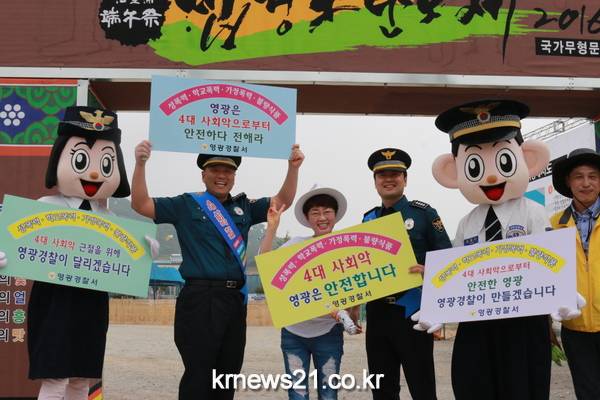 영광경찰서(서장 김상철)에서는 법성 단오제 행사 기간 동안 군민들을 상대로 국정과제인 부정·불량식품 단속과 노인상대 전화금융사기 예방홍보 등 다양한 홍보활동을 전개하는 캠페인을 실시하였다.