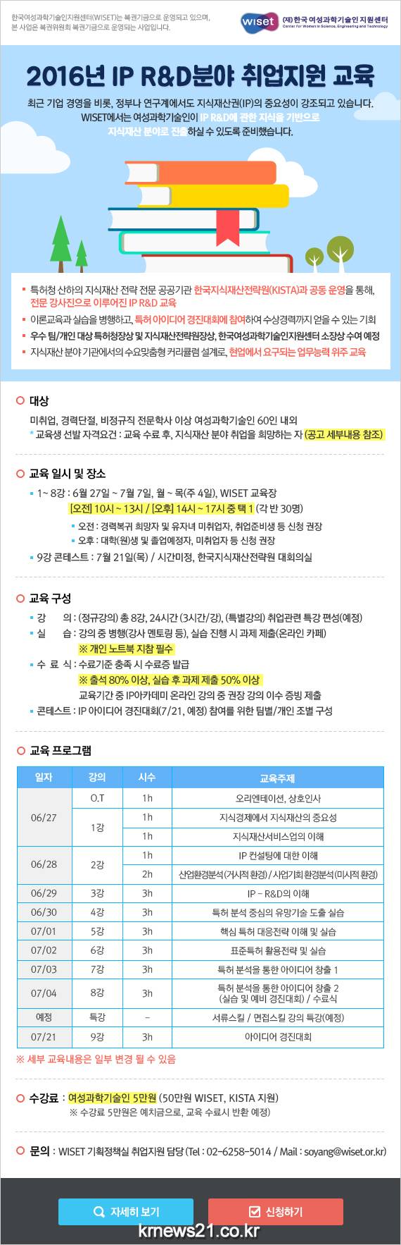 미취업(대학 및 대학원 2016년 8월 졸업예정자 가능) 및 경력 복귀를 희망하는 이공계 전문학사 이상 여성이면 누구나 신청가능하며 24일까지 WISET아카데미 홈페이지를 통해 최종 교육생을 선발할 예정이다. 교육료는 5만원으로 수료 후 전액이 반환된다.