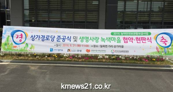 안성시는 자살예방 및 생명존중 문화를 조성하기 위하여 오는 21일 일죽면 가리 상가마을회관에서 생명사랑 녹색마을 협약 및 현판식을 갖는다고 밝혔다.