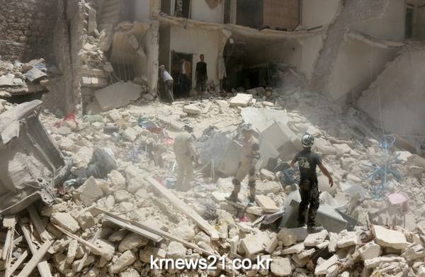 시리아 구조 대원들이 알레포 북부 도시의 반군 지역인 타리크 알 바브(Tariq al-Bab)에서 시리아 정부군의 공격으로 파괴된 건물 잔해 사이를 수색하고 있다.
