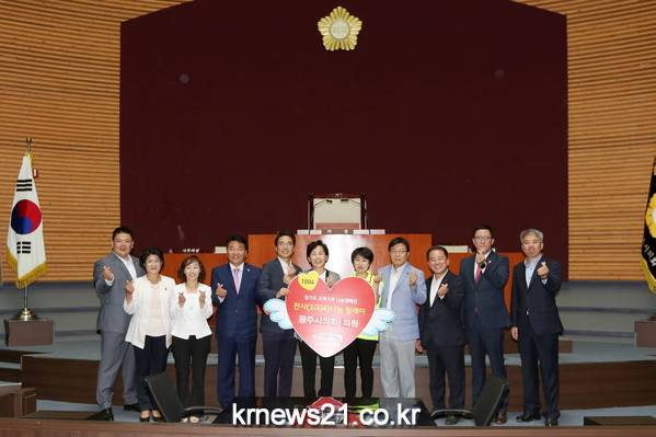 광주시의회(의장 소미순)는 6월 20일(월) 제245회 정례회 제1차 본회의 종료 후 의장실에서 경기 사회복지 공동모금회와 ‘착한일터 1004나눔 릴레이’ 가입식을 가지고 시의원들의 가입 신청서를 전달했다.