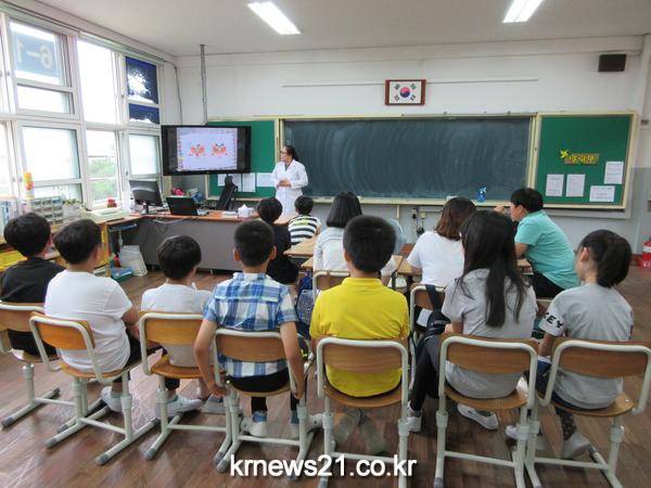 광산구 우산건강생활지원센터는 교실을 방문해 구강 건강관리 요령과 올바른 칫솔질을 소개하고 있다.