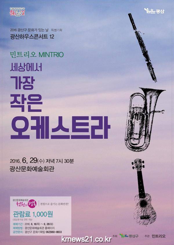 광주 광산구(구청장 민형배)는 오는 29일 저녁 7시 30분 광산문예회관에서 민트리오 ‘세상에서 가장 작은 오케스트라’ 공연을 ‘하우스콘서트’ 형식으로 개최한다.