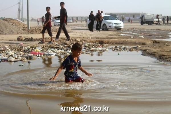 이라크 난민 아동이 팔루자 캠프 근처의 물 웅덩이에서 물놀이를 즐기고 있다.