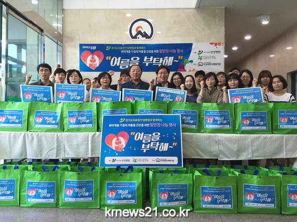 이번 행사는 음식재료를 구입하거나 조리에 어려움이 있어 여름철 건강유지에 어려움이 있는 독거노인, 장애인 가정 등의 취약계층을 대상으로 경기도의료원 안성병원의 ‘아름다운 하루’ 바자회 수익금과 안성병원의 후원을 통해 진행되었다.