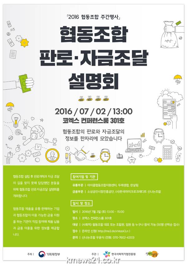 7월 2일(토) (사)한국마이크로크레디트 신나는조합이 기획재정부 주최 ‘2016년 협동조합의 날’ 행사의 하나로 ‘협동조합 판로·자금조달 설명회’를 코엑스(남측) 컨퍼런스룸 301호에서 개최한다.