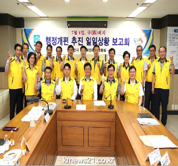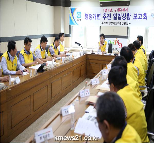 부천시는 7월 4일 전국 최초로 3개 일반구를 폐지하는 혁신적인 행정체제 개편시행이 초읽기에 들어가면서 7월 1일부터 8일까지 시민불편 제로를 위한 ‘행정혁신추진상황실’을 운영한다."고 밝혔다.