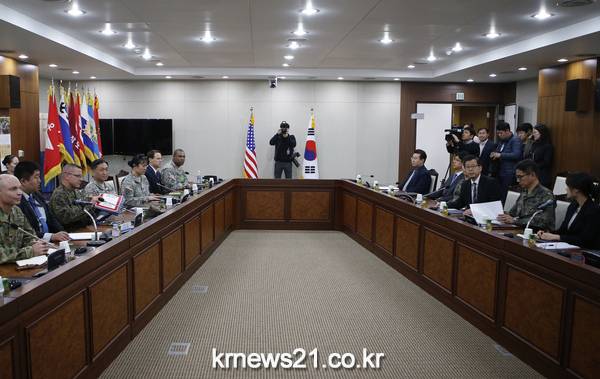 장경수 한국 국방부 정책기획관(오른쪽 두번째)과 로버트 헤드룬드 주한미군사령부 기획참모부장(왼쪽 세번째)