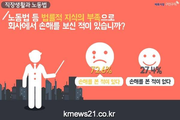 직장인 10명 중 7명은 노동법 등 법률적 지식의 부족으로 회사에서 손해를 본 적이 있는 것으로 나타났다.