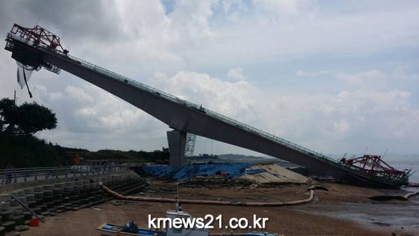 건설중이던 다리는 상판 콘크리트 타설중 고정 장치가 끊어지면서 교각 14번 상판이 바다방향으로 기울 듯 무너져 내렸으며, 이로 인해 작업중이던 인부 6명이 중경상을 입고 인근 병원으로 후송되었다.