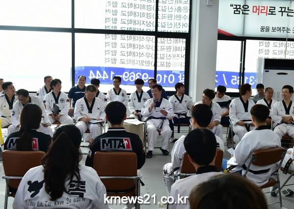 안산시(시장 제종길)는 지난 7월 11일 고잔동 한 태권도 스포테인먼트 대강당에서‘사람중심 이야기마당’ 스물다섯 번째로 태권도 관장 및 감독, 사범 등 100여명이 함께하는 대화의 시간을 가졌다.