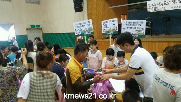“제가 키운 오이에요! 맛있는 블루베리 잼도 있어요!“ 7월 12일 아이들의 한껏 높아진 목소리가 하의초등학교 강당을 채우고 있다.