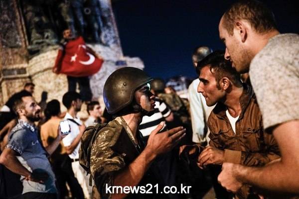 터키 군중들이 탁심 광장에 모여 군사들에게 항의하고 있다.