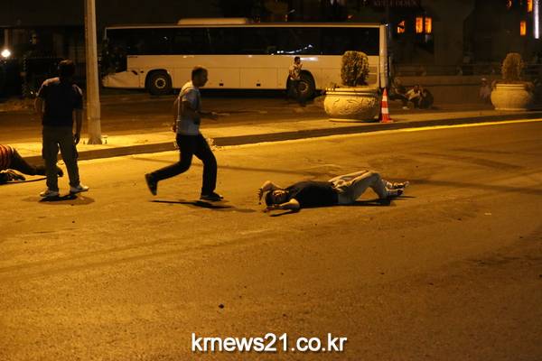 ▲ ADEM ALTAN / AFP [제공자ⓒ 뉴스21통신. 무단전재-재배포 금지.]16일(현지시간) 터키 수도 앙카라에서 부상당한 한 남성이 도로에 누워있다.