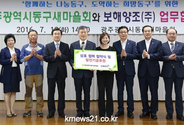 보해양조와 광주 동구 새마을회는 19일 동구청 민방위교육장에서 김성환 동구청장, 임지선 보해양조 대표이사, 임기영 동구 새마을 회장 등 내빈 150여명이 참석한 가운데 업무협약식을 체결했다.