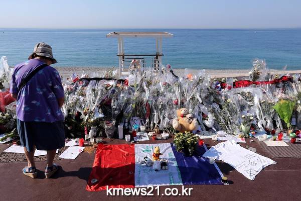 ▲ Valery HACHE / AFP[제공자ⓒ 뉴스21통신. 무단전재-재배포 금지.]프랑스 니스의 트럭 테러 현장에 놓인 꽃과 프랑스 국기