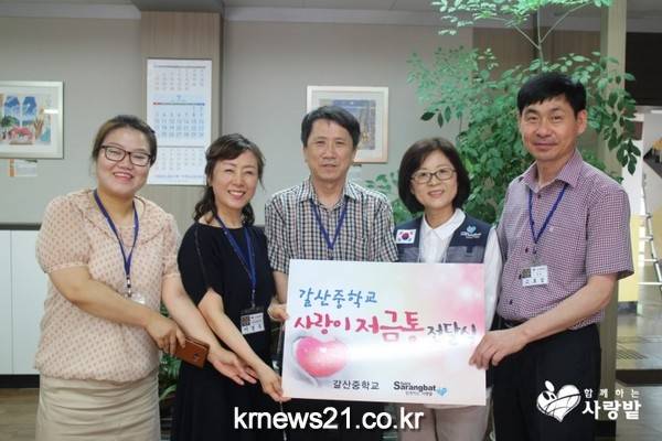 15일 인천 갈산 중학교가 실천하는 NGO 함께하는 사랑밭을 통해 저소득 가정을 위한 후원금을 전달했다.