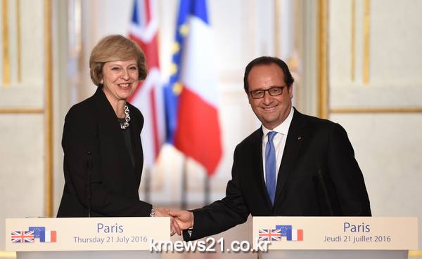 ▲ STEPHANE DE SAKUTIN / AFP[제공자ⓒ 뉴스21통신. 무단전재-재배포 금지.]프랑스를 방문한 테레사 메이 영국 총리(왼쪽)가 프랑스 대통령 프랑수와 올랑드와 회담을 갖고