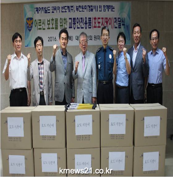 부천원미경찰서(서장 경무관 우종수)에서는 지난 21일(목) 대한노인회 부천지부에서 노인 교통사고 예방을 위한 야간반사스티커가 부착된 효도지팡이 전달식을 가졌다."고 밝혔다.