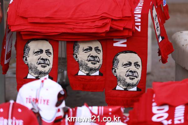 ▲ ADEM ALTAN / AFP[제공자ⓒ 뉴스21통신. 무단전재-재배포 금지.]25일(현지시간) 터키 수도 앙카라에 레제프 타이이프 에르도안 대통령의 얼굴이 그려진 스카프가 걸려있는 모습