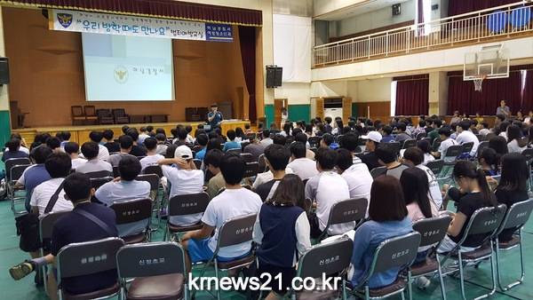 하남경찰서(서장 정경택)은 관내 41개 학교 하계방학 실시로 학교 밖 청소년 선도·보호를 위해 “우리 방학 때도 만나요”라는 주제로 청소년 상대 범죄예방교육 및 학생들과 현장체험학습(합동순찰) 등 전개 중인 가운데, 지난 28일(목) 15:00경 신장초등학교 대강당에서 열린 하남시 자원봉사센터 청소년 여름캠프에 참석한 청소년 약 200명을 대상으로 학교폭력․성폭력 예방 및 올바른 청소년 선도를 위한 범죄예방 교육을 실시하였다.