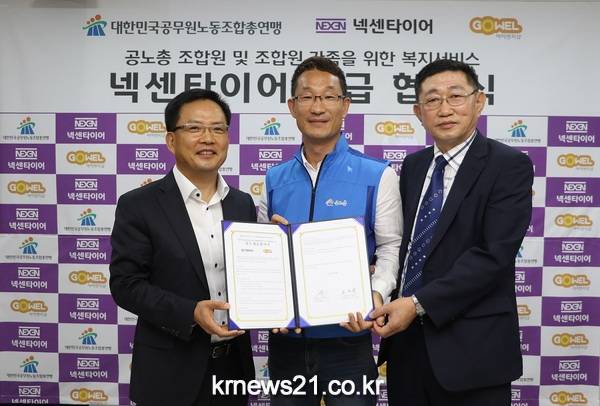 넥센타이어(대표이사 강호찬)가 5일 대한민국공무원노동조합총연맹(이하 공노총) 및 아이엔지샵 주식회사(이하 아이엔지샵)와 타이어 공급 협약식을 가졌다.