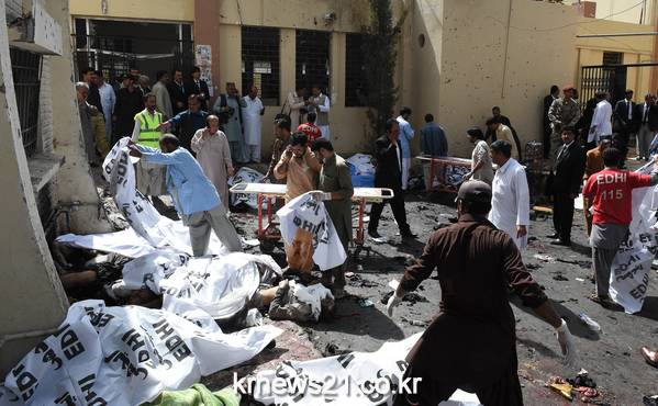 ▲ 파키스탄 발루치스탄 주 퀘타 병원에서 8일(현지시간) 자폭 테러로 사망한 사람들을 흰 천으로 덮고 있다. 이날 테러로 사망자가 최소 70명 부상 112명으로 집계된다고 주 보건당국이 밝혔다. BANARAS KHAN / AFP [제공자ⓒ 뉴스21통신. 무단전재-재배포 금지.]파키스탄 병원에서 8일(현지시간) 발생한 폭발 사고가 자살폭탄 테러인 것으로 밝혀진 가운데 사망자가 초기 20여명에서 최소 93명, 부상자는 120명으로 집계되고 있다.