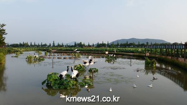 무안군(군수 김철주)이 최대 백련 자생지인 회산백련지를 찾는 관광객에게 한 송이의 연꽃이라도 더 감상할 수 있도록 봄부터 준비한 성과가 축제를 앞두고 8월이 시작되자 초록이 출렁이는 드넓은 연잎의 바다 위에 순백의 연꽃이 수많은 학이 내려앉은 모습으로 흐드러지게 피어나고 있는 것이다.