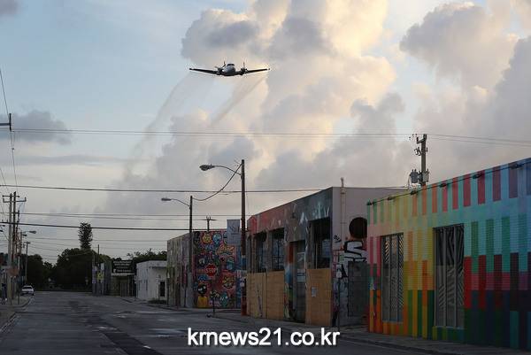 ▲ 자생 모기에 의해 지카 바이러스가 감염되고 있는 미국 플로리다 마이애비 북부 윈우드 지역에서 6일(현지시간) 비행기가 모기를 줄이기 위한 살충제를 뿌리고 있다. JOE RAEDLE / GETTY IMAGES NORTH AMERICA / AFP [제공자ⓒ 뉴스21통신. 무단전재-재배포 금지.]미국 두 번째 지카 감염 사망자가 텍사스에서 나왔다.
