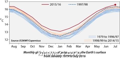 2016년 8월 11일 유럽중기예보센터(European Centre for Medium-range Weather Forecasts, 이하 ECMWF)에서 운영하는 코페르니쿠스 기후변화서비스(Copernicus Climate Change Service)가 제공한 기상자료 분석 결과에 따르면 지표면 대기 온도의 평균 절대값이 2016년 7월 신(新) 고점을 기록했다.