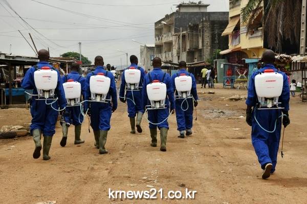 ▲ AFP / Sia Kambou[제공자ⓒ 뉴스21통신. 무단전재-재배포 금지.]코트디부아르 아비잔(Abidjan) 지역에서 11일(현지시간) 지카 바이러스 확산을 막기위해 방역에 나선 사람들.