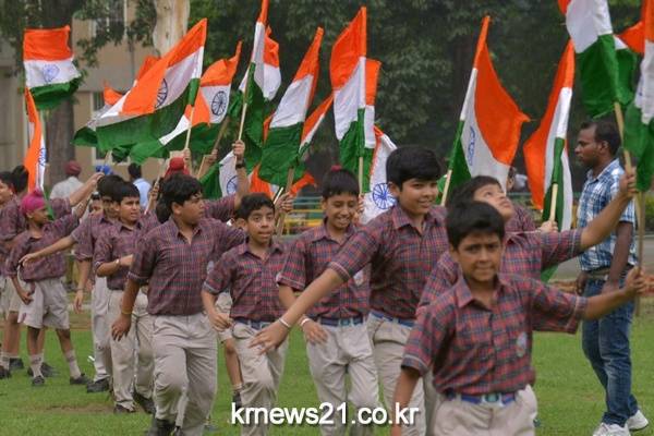 ▲ AFP / Narinder Nanu[제공자ⓒ 뉴스21통신. 무단전재-재배포 금지.]인도 암리차르에서 11일(현지시간) 아이들이 국기를 흔들며 독립기념일 퍼레이드 리허설을 하고 있다.