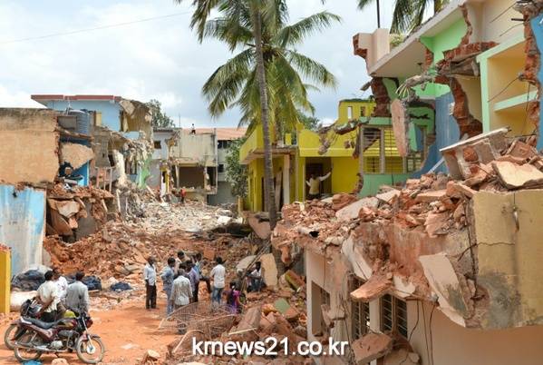 ▲ AFP / Manjunath Kiran[제공자ⓒ 뉴스21통신. 무단전재-재배포 금지.]인도 남부 카르나타카 주 주도인 방갈로르 지방 자치 당국이 불법 건축물을 철거한 곳에서 주민들이 모여있다.