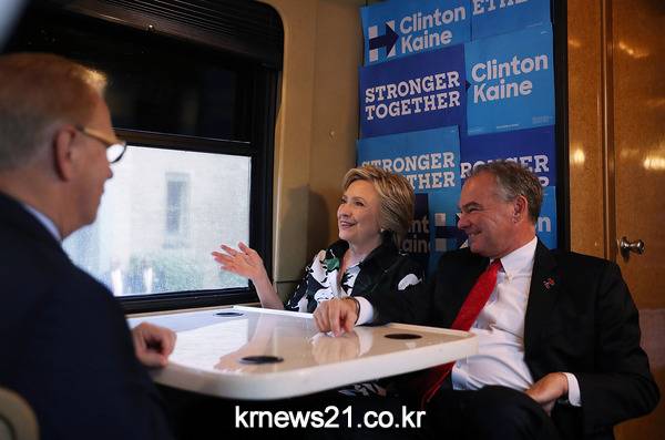 ▲ 미국 민주당 대선후보인 힐러리 클린턴(왼쪽)과 부통령 러닝메이트 팀 케인(오른쪾)이 선거 유세 활동을 위해 지난 31일(현지시간) 오하이오 클리블랜드의 선거 유세 버스에 앉아있는 모습 . JUSTIN SULLIVAN / GETTY IMAGES NORTH AMERICA / AFP[제공자ⓒ 뉴스21통신. 무단전재-재배포 금지.]힐러리 클린턴 미국 민주당 대선후보 측이 12일(현지시간) 클린턴과 부통령 러닝메이트인 팀 케인의 지난해 소득신고서와 납세자료를 공개하며 라이벌인 공화당 도널드 트럼프의 세금 의혹을 정조준했다.