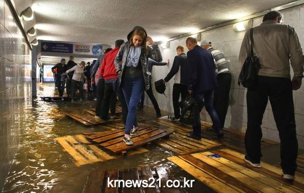 ▲ AFP / Vasily Maximov[제공자ⓒ 뉴스21통신. 무단전재-재배포 금지.]러시아 모스크바의 지하 보행로에 물이 차 사람들이 나무 판을 밟으며 지나가고 있다.