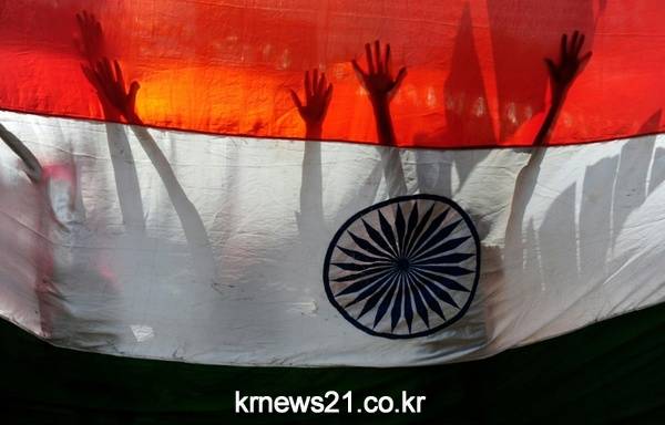 ▲ AFP / Arun Sankar[제공자ⓒ 뉴스21통신. 무단전재-재배포 금지.]인도 첸나이에서 8월 15일(현지시간) 독립기념일 70주년을 축하하는 아이들의 실루엣이 인도 국기 너머로 보이고 있다.