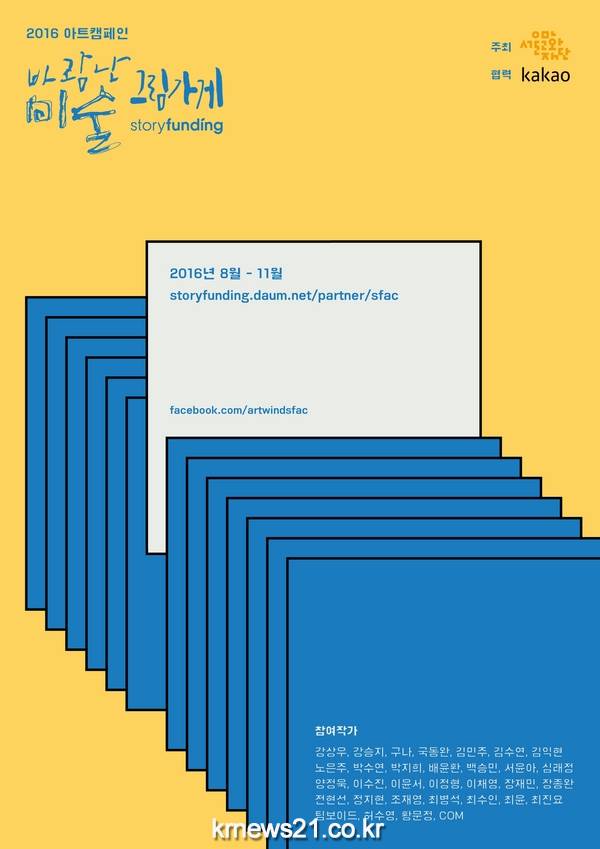 이번 스토리펀딩에 참여하는 예술가는 서울시립미술관, 국립현대미술관, 아르코 인사미술공간 등 국내 유수의 시각예술 전문기관에서 추천한 작가 104명 중 배윤환, 팀보이드, 김익현, 정지현, COM, 구나 등 32명이 최종 선발됐다. 한편 큐레이터로는 유진상 교수(계원예술대 융합예술과)가 선임됐다. 유진상은 국제갤러리 디렉터를 거쳐, 2012 미디어아트 비엔날레와 2008 아시아프(ASYAAF) 총감독을 역임한 시각예술 전문가로 신진예술가 발굴에 힘쓴 바 있다.