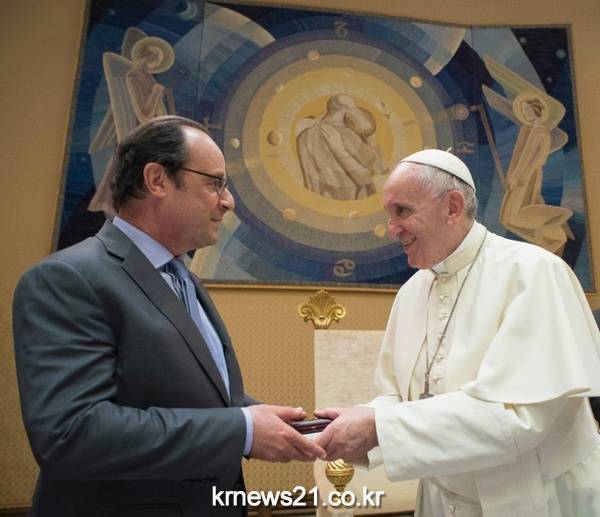 ▲ OSSERVATORE ROMANO / AFP / -[제공자ⓒ 뉴스21통신. 무단전재-재배포 금지.]무신론자로 알려진 프랑스 대통령 프랑수와 올랑드가 지난달 25일 자크 아멜 신부가 IS 충성을 맹세한 10대로부터 살해 당한 이후로는 처음으로 바티칸을 방문해 프란치크소 교황을 만났다.