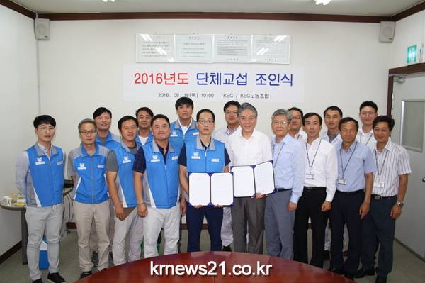 KEC가 18일 KEC구미공장에서 6년 연속 평화적 무파업 타결이라는 새로운 노사 관계의 역사를 쓰며 2016년 임단협 조인식을 진행했다고 밝혔다. 이 자리에는 황창섭 대표이사, 공국희 노동조합위원장 등 관련 임직원이 참석했다.