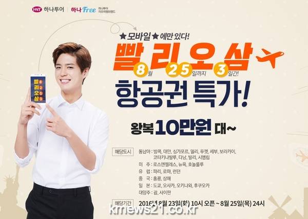 하나투어가 23일(화) 오전 10시부터 25일(목)까지 3일간 모바일 전용 특가항공권을 판매한다.