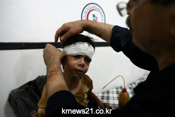 시리아 수도 다마스커스 북동쪽에 위차한 도우마(Douma)에서 일어난 공습으로 부상당한 아이가 임시병원에서 치료를 받고 있다.