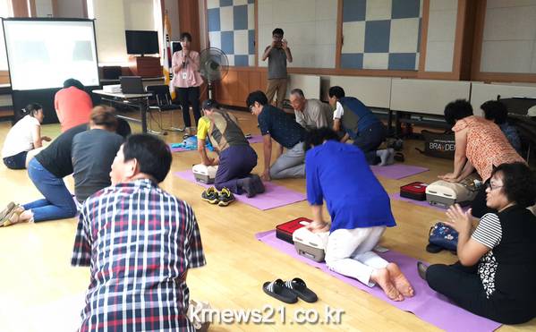이날 교육은 통장, 부녀회원, 주민 등 30여명이 참여한 가운데 심장마비 대응방법, 심폐소생술, 자동제세동기 사용법 등에 대한 이론과 실습 교육으로 진행됐다.