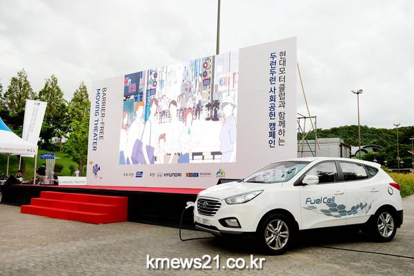 현대자동차 연합동호회 ‘현대모터클럽’이 현대자동차와 함께 27일(토) 경기도 과천 서울대공원 분수대 광장에 이동식 스크린을 설치하고 시청각장애인을 위한 ‘배리어프리 영화관’을 열었다.